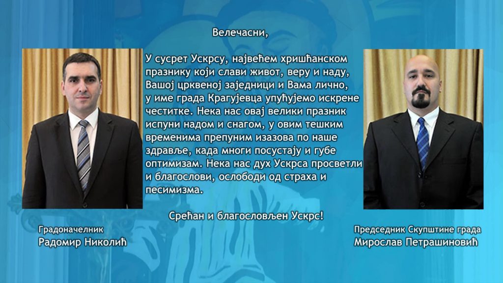 У сусрет Ускрсу, највећем хришћанском празнику који слави живот, веру и наду, Вашој црквеној заједници и Вама лично, у име града Крагујевца упућујемо искрене честитке.