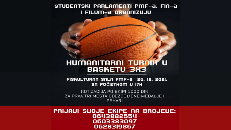 Студентски парламенти Филолошко-уметничког факултета, Факултета инжењерских наука и Природно-математичког факултета Универзитета у Крагујевцу у недељу, 26. децембра, организују хуманитарни турнир у баскету 3х3.