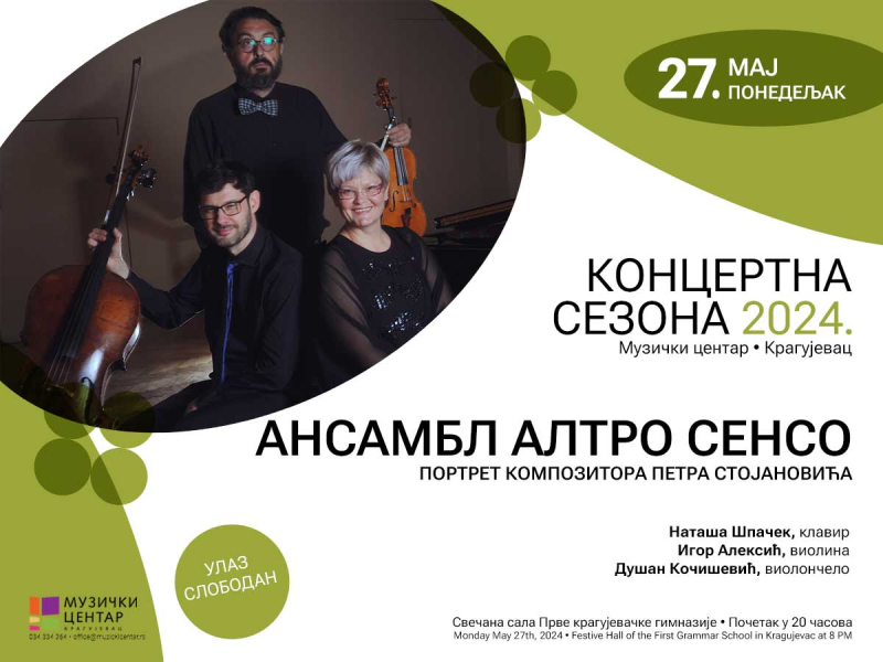 Музички центар Крагујевац, у оквиру концертне сезоне, организује мултимедијални пројекат “Ансамбл Алтро Сенсо“ Портрет композитора Петра Стојановића у понедељак 27. маја 2024. године у Првој крагујевачкој гимназији од 20 часова.
