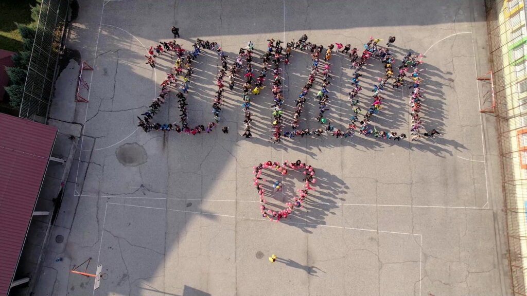 На видео снимку који је направљен дроном, јасно се виде малишани који су формирано исписали датум обележавања Светског дана детета 20.11.2021. са великим срцем испред њих, које означава љубав и важност сваког малог бића.