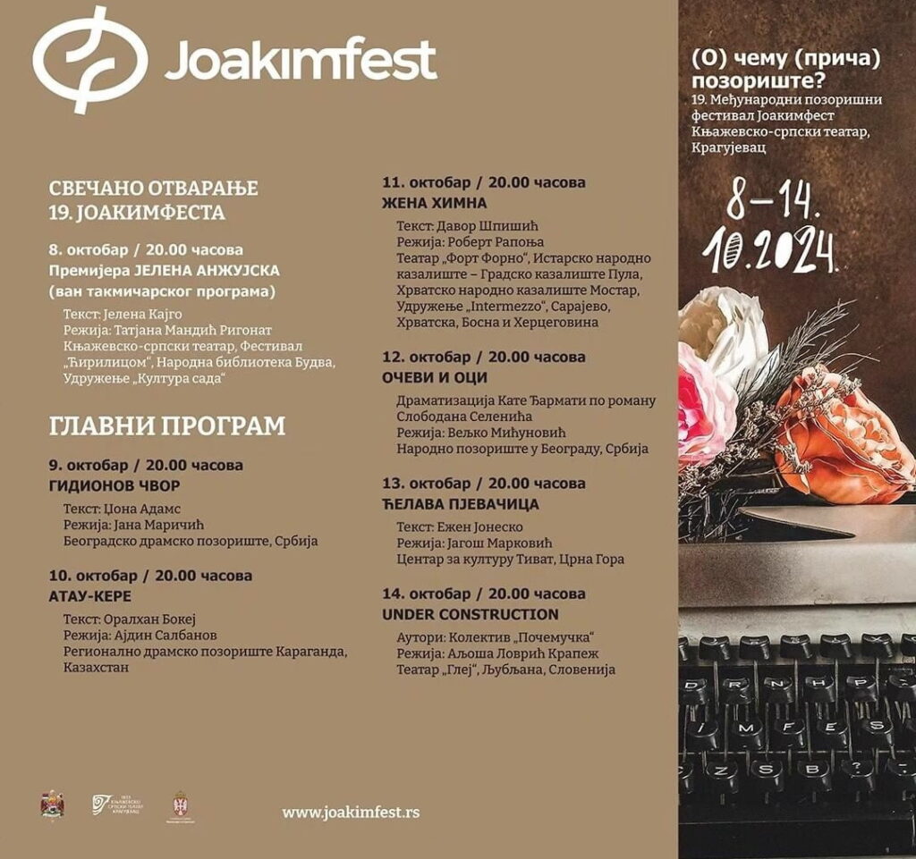 Међународни позоришни фестивал 19. Јоакимфест под слоганом „(О) чему (прича) позориште” биће одржан од 8. до 14. октобра у Књажевско-српском театру у Крагујевцу.