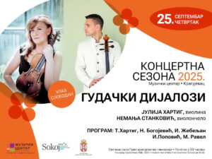 У Свечаној сали Прве крагујевачке гимназије, вечерас од 20 часова, биће одржан концерт под називом Гудачки дијалози, у извођењу виолинисткиње Јулије Хартиг и виолончелисте Немање Станковића.