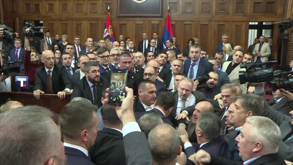 У Скупштини Србије је дошло до физичког обрачуна између посланика власти и опозиције, пошто су посланици опозиције након усвајања дневног реда прво подигли транспаренте, а потом покушали физички да спрече почетак расправе када су у салу ушли чланови Владе.