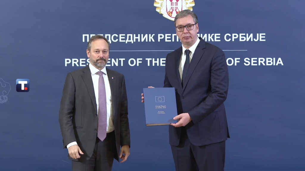 Председник Александар Вучић изјавио је данас после састанка са шефом Делегације ЕУ у Србији Емануелеом Жиофреом, који му је предао Годишњи извештај ЕК о Србији за 2024. годину, да је Србија на европском путу и да може да испуни готово све критеријуме из Агенде раста и реформске агенде до 2027. године без обзира да ли ћемо постати до тада члан Уније.